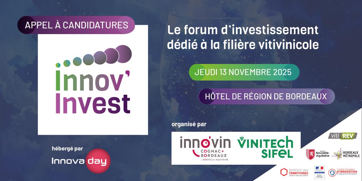 Pourquoi participer ? Innov'Invest est le seul forum d'investissement au monde dédié aux entreprises du secteur vitivinicole. Organisé par INNO'VIN en partenariat avec le salon mondial VINITECH SIFEL, il sélectionne les startups les plus innovantes de la winetech française et les met en relation avec des investisseurs, financeurs et partenaires de l'innovation. Accueilli au sein du forum Innovaday, l'évènement Innov'Invest accueillera tout au long de la journée des startups sélectionnées et des investisseurs (généralistes et spécialisés dans la flière vin) autour de rendez-vous B to B programmés. Des animations viendront enrichir la journée, notamment des ateliers Innovaday consacrés aux levées de fonds avec un focus sur la winetech, ainsi qu’une session “Pitch ton deck” devant des business angels. Ces temps forts seront également ouverts à certaines startups non retenues par le jury.