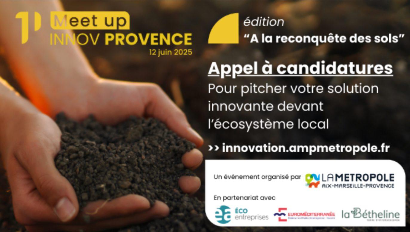 📣📣 La Métropole Aix-Marseille-Provence, en partenariat avec Euroméditerranée, Éa éco-entreprises et La Bétheline lancent l'appel à candidatures auprès des décideurs et entreprises innovantes du territoire dans le domaine de la gestion des sols pour venir "pitcher" devant l'écosystème territorial. 🎯L'objectif : rapprocher les donneurs d'ordre publics et privés des entreprises proposant des solutions innovantes pour répondre à des problématiques concrètes. L'événement vise à favoriser les rencontres entre l’offre et la demande : l'occasion de découvrir les besoins du secteur, s'inspirer, développer son réseau et booster son développement par l'open innovation. Vous avez une solution innovante ou une expression de besoin d'innovation dans les domaines suivants : - Diagnostic des fonctions des sols et de leur potentialité - Innovations pour une remise en fonction efficace des sols dégradés - Pratiques agricoles et forestières régénératives des sols - Amélioration des fonctions des sols VENEZ LA PITCHER !