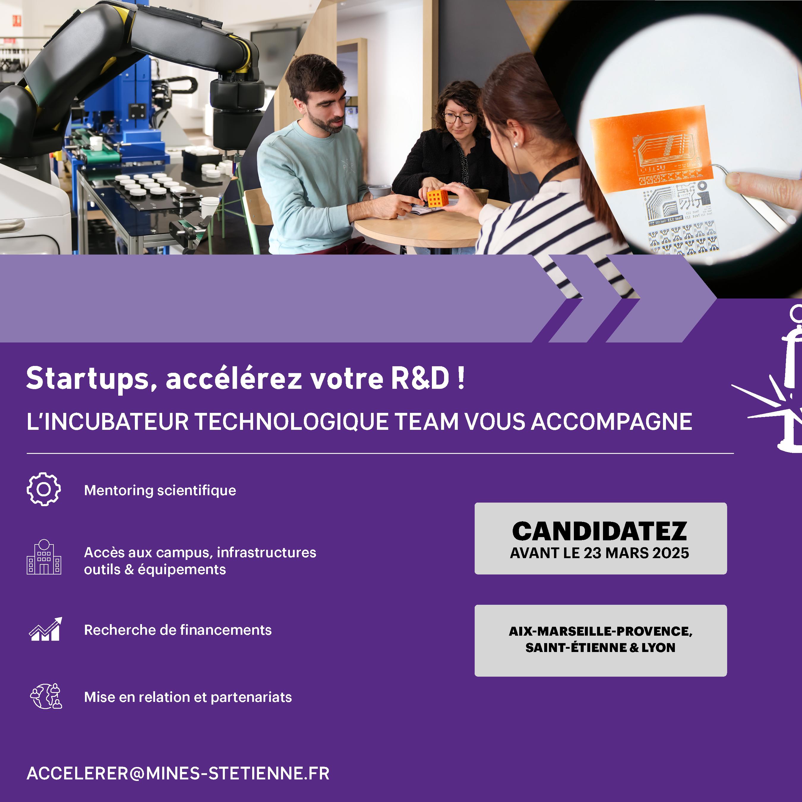 📢 Startups deeptech, accélérez votre R&D avec TEAM ! Vous développez une innovation technologique et recherchez un accompagnement scientifique de haut niveau ? L’incubateur TEAM de Mines Saint-Étienne lance son appel à candidatures ! 𝗣𝗼𝘂𝗿𝗾𝘂𝗼𝗶 𝗿𝗲𝗷𝗼𝗶𝗻𝗱𝗿𝗲 𝗧𝗘𝗔𝗠 ? ✅ Mentoring scientifique Bénéficiez de l’expertise des enseignants-chercheurs et ingénieurs de recherche de Mines Saint-Étienne. ✅ Infrastructures de pointe Accédez à des plateformes technologiques, laboratoires et outils numériques de haut niveau. ✅ Réseau académique & industriel Intégrez un écosystème stimulant pour accélérer votre développement. ✅ Opportunités de financement Bénéficiez d’un accès privilégié aux investisseurs et aux dispositifs de soutien à l’innovation. 📅 Candidatez avant le 23 mars 2025 et donnez un coup d’accélérateur à votre startup ! 📩 Plus d’infos et candidature : accelerer@mines-stetienne.fr 👉 + d’infos : https://lnkd.in/eJZ6cwfh