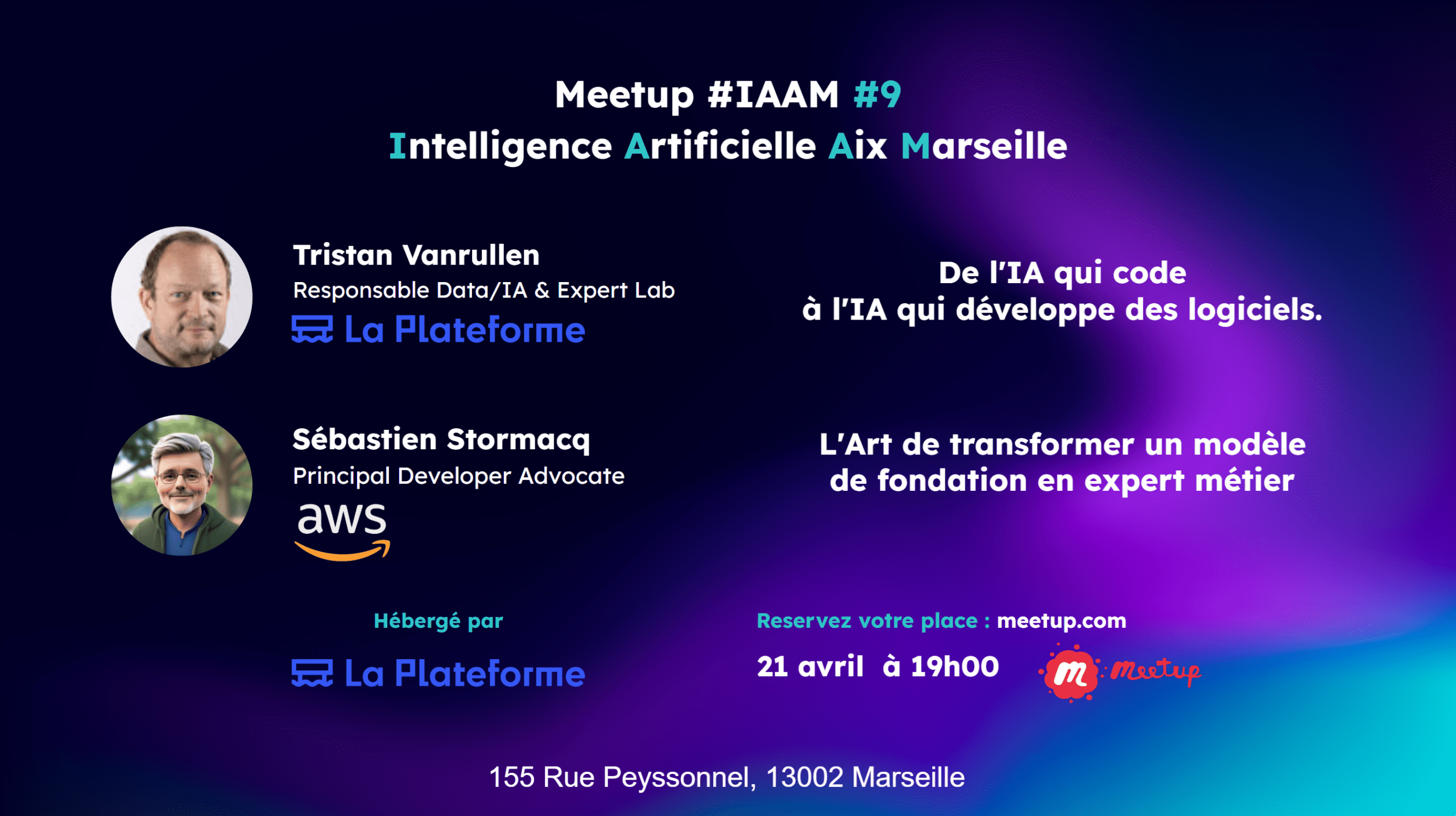 Meetup IAAM #9 – Intelligence Artificielle Aix-Marseille La communauté IA Aix Marseille se retrouve pour une 9ᵉ édition à Marseille ! 📅 Mardi 21 avril à 19h 📍 La Plateforme, 155 Rue Peyssonnel, 13002 Marseille (Nouvelle adresse) 🎙 Tristan Vanrullen Responsable Data/IA & Expert Lab @ La Plateforme De l’IA qui… Read More
